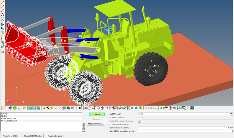 - グラウンドボディに属しているグラフィックスとの連成は現在サポートされていません。MotionViewで作成したシステムにグラフィックスを追加せずに、別途、そのグラフィックスをEDEMに転送する必要があります。