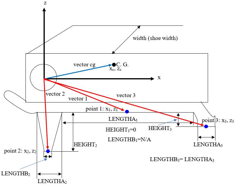 Figure 1. 3つの典型的な接触点を持つクローラ・履帯リンクのスキーム。C.G.座標系はボディ座標系と平行にする必要があります。