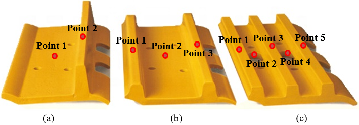 Figure 2. クローラ・履帯リンク:(A) グローサーが1つで2つの接触点を持つリンク、(b) グローサーが2つで3つの接触点を持つリンク、(c) グローサーが3つで5つの接触点を持つリンク。