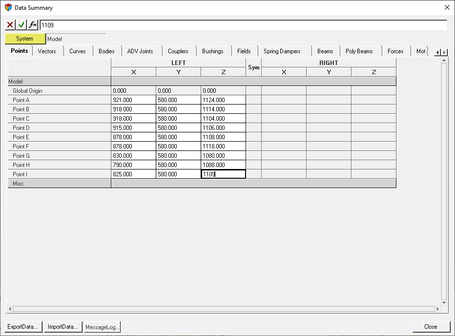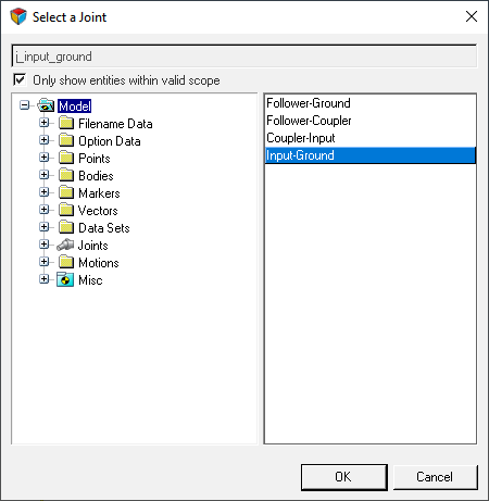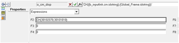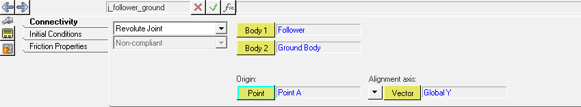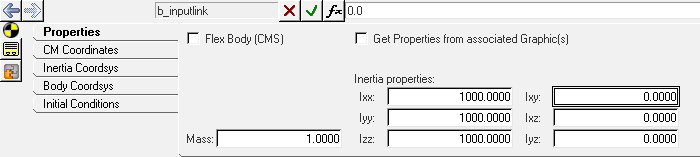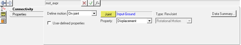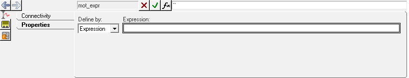 | Expressions | この種のフィールドは、パラメトリックな式とテキストとのコンビネーションを含み得る点で、上記の3つとは異なります。一般的に、フィールドは、ソルバー関数(またはソルバーによって認識される関数)を定義するために使用されます。この種の式はバッククォーテーション(` `)に囲まれ、任意のパラメトリックリファレンスは波括弧{}に囲まれて与えられます。バッククォーテーションの存在は、Templexを介して式を渡すことをmath parserに提案します。Templexは波括弧内の式を評価し、その他のテキスト部分は保持します。例えば、式 ` DX({b_inputlink.cm.idstring},{Global_Frame.idstring})`では、TemplexはInput linkボディ (b_ inputlink)のcmのID(文字列)とマーカーGlobal FrameのIDを評価し、“DX”はそのまま保持します。これらのフィールドは、Bushings、Motions、Forcesなどのパネルに、これらのエンティティ内のカーブ入力のExpression、Independent variable、タイプExpressionのOutputsに切り替えられるプロパティと共に用意されています。 |