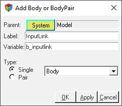 このステップでは、デフォルトのエンティティを使って、2つのボディ間に変位出力を追加します。また、Expressionsに基づき全体フレームに対する入力リンク上の特定ポイントGの変位を記録するため、別の出力を追加します。