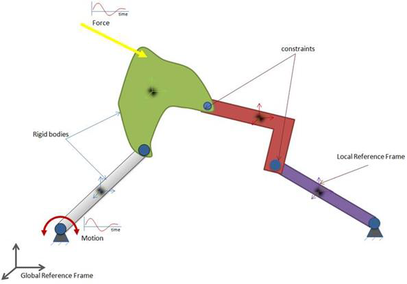 - 古典的なMBD定式は、剛体モデリングのアプローチを用いて機構をモデル化します。剛体は、変形が無視できないボディとして定義されます。一般的に、MBD問題を解くには、ソルバーは下記の情報を必要とします。