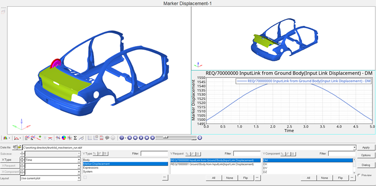 このステップでは、MotionSolveを使って、シミュレーション時間5秒、ステップサイズ0.01秒で、トランク機構の運動学解析を実行します。