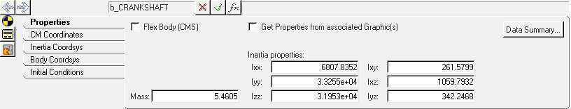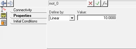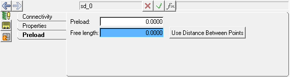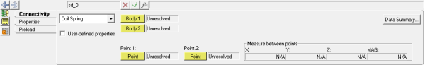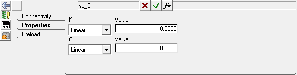 - クライアント固有のツールバーの下は、選択されたエンティティの値やプロパティの確認や修正が行えるパネル領域です。パネルには、選択されたエンティティタイプの各種プロパティや値をまとめたいくつかのタブが含まれる場合があります。例えば、Spring Damperパネルでは、結合情報とプロパティが3つのタブに表示されています(下の図参照):