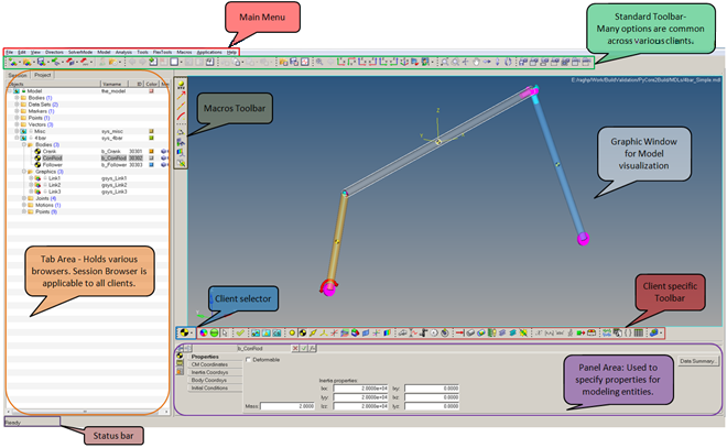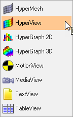 - MotionViewは、HyperWorks Desktop(HWD)フレームワーク下のクライアントのひとつです。このフレームワークは、すべてのクライアントについて共通したレイアウトを提供します。このフレームワーク下に用意されているクライアントにはこのほか、HyperMesh、HyperView、HyperGraph 2D、HyperGraph 3D、MediaView、TextView、TableViewがあります。クライアントは、クライアント選択ドロップダウンメニューを使って選択または変更することが可能です: