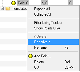 例えば、ポイントエンティティを右クリックすると、ポイントエンティティをDeactivate(非アクティブ化)、Rename(名称変更)、Add(追加)、Delete(削除)、またはCut(カット)するオプションと、エンティティをフィルタリングするためのオプションがコンテキストメニューで表示されます。