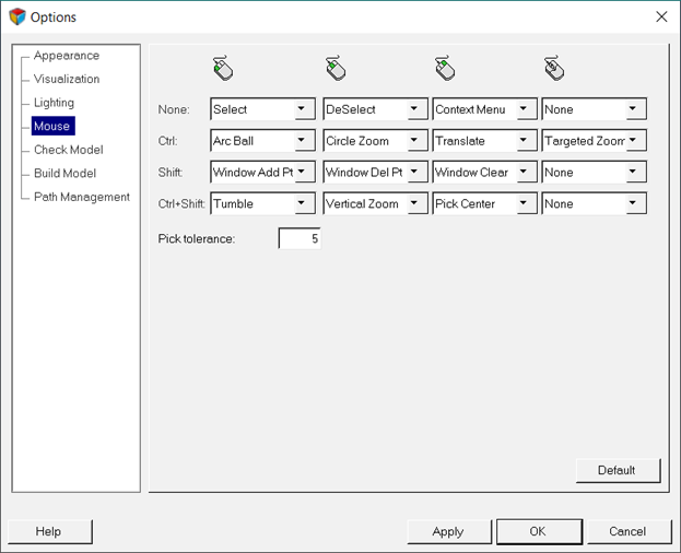 - グラフィックスウィンドウは、モデルについてインタラクティブに作業を行うことのできる、モデルの表示領域です。 モデルの表示に使用可能なマウスクリックについて、以下の一覧に示します:
