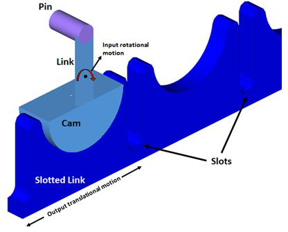 - 溝付きリンク機構(スコッチヨーク機構とも呼ばれる)は、入力の回転運動を、溝付きリンクまたはヨーク部の連続的または断続的な並進運動に変換します。運動は、接触する機構のパート間の接触力を介して伝えられます。接触垂直抗力と摩擦力は共に、運動の伝達に関与し得ます。このような機構は、バルブアクチュエーター、エアコンプレッサー、一部のレシプロエンジンやロータリーエンジンなどに共通して応用されます。