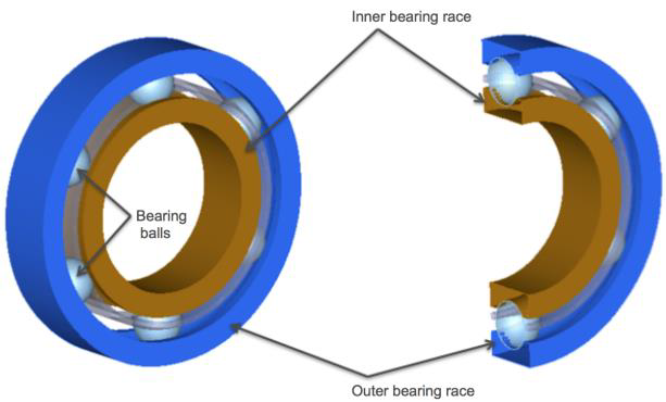 Figure 1. 玉が6個の典型的な玉軸受の形状。切断面は、玉が内輪と外輪に接触している様子を示している。