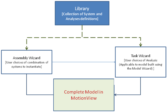 - パネル内で選択されたシステムは、MotionViewクライアントライブラリに含まれるシステム定義を使ってインスタンス化され、異なるシステム群から成るモデルを構築します。Attachment Wizardは、インスタンス化される各システムについて使用可能なアタッチメント(取り付け先)のオプションを選択するために使用されます。