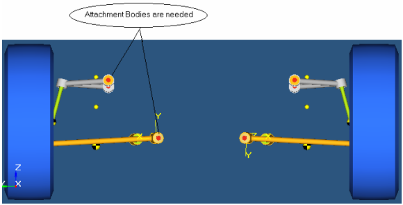 - 下の図は、SLAサスペンションのシステム定義を表わしたものです。これは、ボディとポイントが結合されるべきアタッチメントについての情報を必要とする不完全なシステムです。