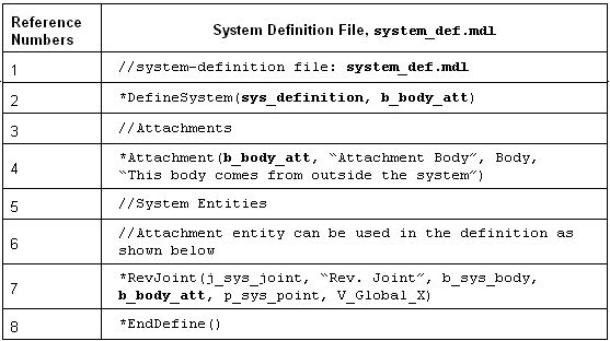 Reference Numbers System Instantiation with Definition 1 // Model : Body.mdl*BeginMDL(base_model, "Base Model")2 //Instantiate the system definition sys_definition*System(system1, "First System", sys_definition, B_Ground)3 //Begin System Definition Block*DefineSystem(sys_definition, b_att)4 //Declare a body attachment to the system*Attachment(b_att, "Body Attachment", Body, "Add an body external to this system5 //Entities within the system*Point(p_sys, "Point in the system")*Body(b_sys, "Body in the system")6 //Define a joint with the body b_sys and the body attachment b_att*RevJoint(j_rev, "Revolute Joint", b_sys, b_att, p_sys, VECTOR, V_Global_X7 *EndDefine() //End Definition Block8 *EndMDL() - 変数名system1のシステムインスタンスは、定義