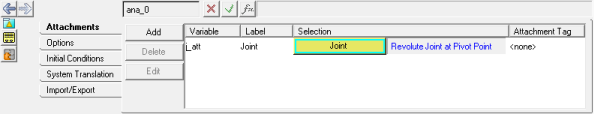 アナリシス定義ファイルの*Attachment()ステートメント(行4)で宣言され、*DefineAnalysis()ステートメント(行3)に引数として現れるアタッチメントの変数名。モーションは、*Motion()ステートメント(行6)を使ってこのジョイントに適用されます。 |