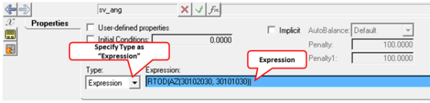 SolverVariableパネルのPropertiesタブの下でTypeをExpressionに指定し、Expression欄に`RTOD({j_4.AZ})`と入力します。