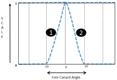 Figure 47. 2つのSTEP関数の積は、Figure 49に示すとおり、スケールを0から1へと徐々に増加させ、次に0へと戻し、一方で前尾翼の角度位置は-10degから10 degへと変化するよう評価します: