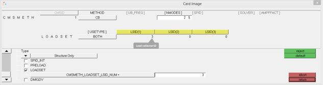 先の手順でモデル化された3つの荷重ケースは、節点力を表します。これらの節点力は、CMS法を用いてモーダル荷重に変換されます。このステップでは、既存のCMSMETHが3つの荷重セットを含むように修正します。