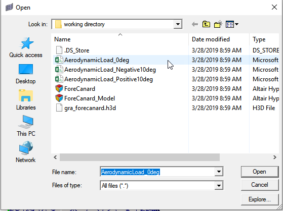 Openダイアログで自身の<作業ディレクトリ>に進み、AerodynamicLoad_0deg.csvを選択します。続いて、Openをクリックします。