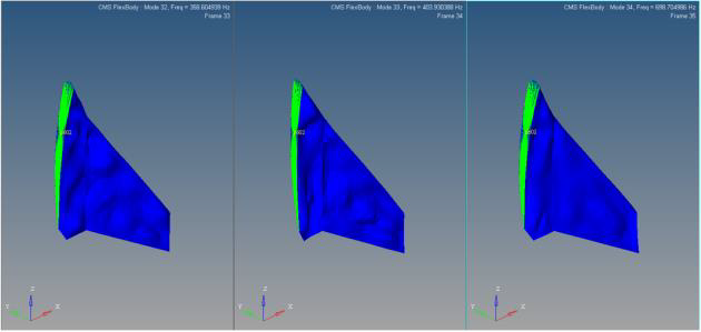 ソルバー実行が正常に終了したら、OptiStructの実行から作成されたflexbody flex_ForeCanard.h3dをHyperViewで開き、各モード形状を確認します。弾性体には、ノーマルモード、拘束モード、および静変形モードの合わせて34のモードが含まれています。