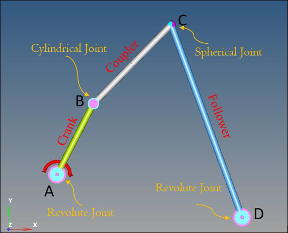 Figure 1. ジョイントタイプなしの4節リンクモデルTable 1. Point X Y A -45 45 B 65 260 C 300 500 D 515 -85
