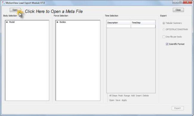 MotionViewモデルについてMS/ADAMSソルバーを実行すると、メタデータファイル(ボディについての荷重出力リクエストが含まれたMotionViewから書き出されるASCIIファイル)が得られます。