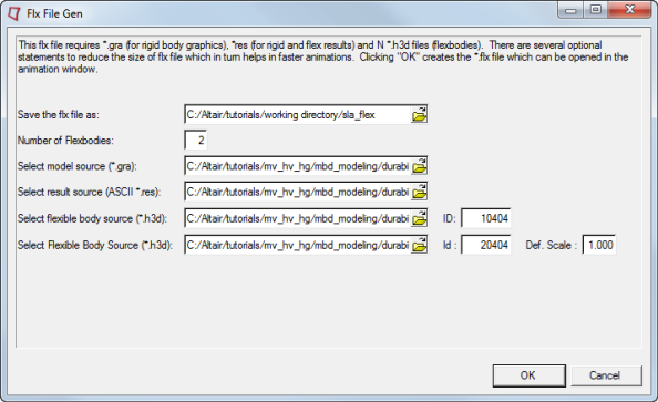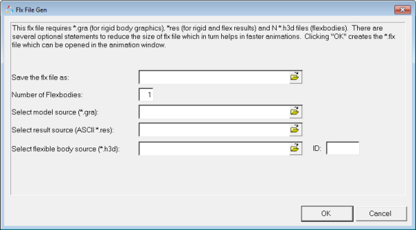 Flex File Gen機能では、Flex File Genツールを使って.flxファイルを作成することが可能です。このファイルは、.graファイル(剛体グラフィックス)、.resファイル(弾性体および剛体結果)および.h3dファイル(弾性体グラフィックス)を参照します。これらのファイルは、弾性体を含むADAMS結果のアニメーション表示に必要とされます。.flxファイルは、アニメーションウィンドウへ直接読み込むことが可能です。