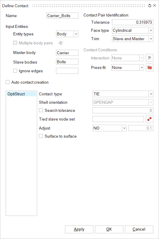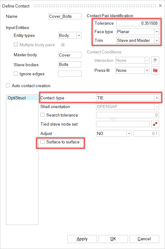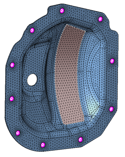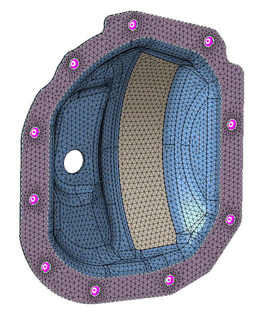 最初の荷重ケースは、ボルトにプリテンションをかけ、キャリアボディの端部に拘束を定義した非線形静解析です。2つ目の荷重ケースは、カバーボディの内側面に圧力荷重をかけ、その圧力荷重を利用して加振荷重を発生させるモーダル法による周波数応答解析です。1つ目の荷重ケースでのボルトのプリテンションの効果は、2つ目の荷重ケースにも含まれています。接触は、モデルの各パート間に生成されます。