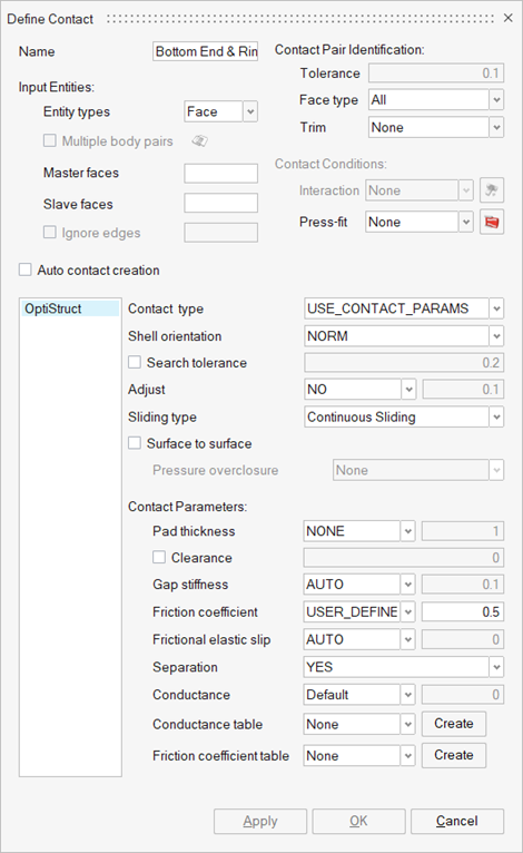 In the Define Contact dialog, set the parameters as shown