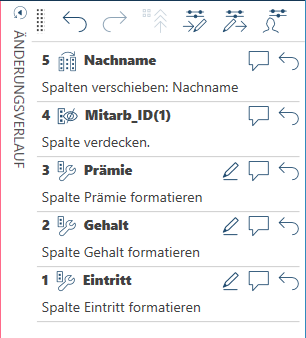 Der Änderungsverlauf ist eine Aufzeichnung aller an einer Tabelle oder Spalte vorgenommenen Änderungen, einschließlich irgendwelcher vor dem Laden angewendeten Filter oder Zeilenauswahl-Vorgänge. Diese Liste kann auf eine beliebige Tabelle, deren Spalten die gleichen Namen und Datentypen enthält, erneut angewendet werden. Änderungsverläufe können sowohl importiert und exportiert, als auch auf Tabellen angewendet werden, die der Tabelle ähnlich sind, von der der importierte/exportierte Änderungsverlauf erstellt wurde.
