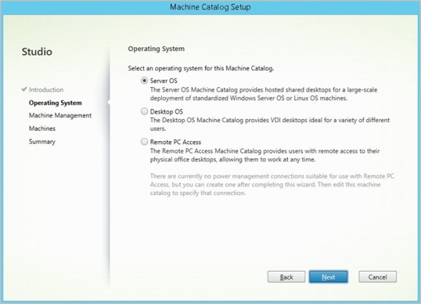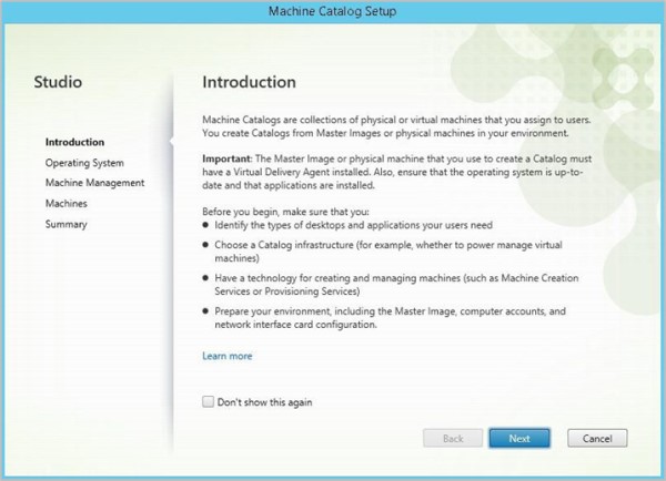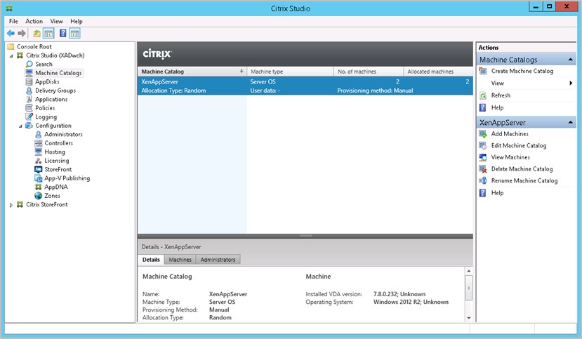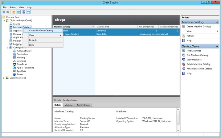 Right-click on Machine Catalogs in the tree on the left-hand pane and, from the menu that displays, select Create Machine Catalog.