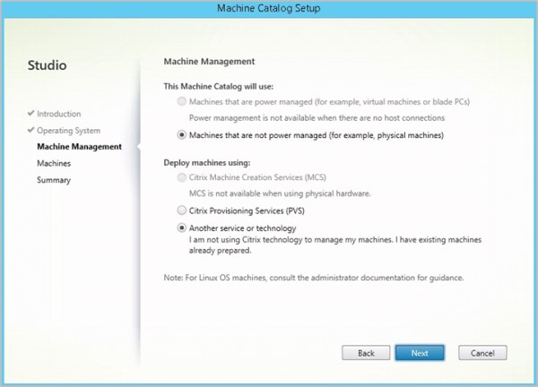 In the Machine Management screen that displays, select Another service or technology if the machine for which a catalog to be created is not managed by Citrix Provisioning Services or Machine Creation Services (e.g., a virtual machine). Click Next afterward.