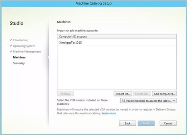 In the Machines screen that displays, click Add computers and, in the Select Computers dialog that displays, locate and select the Computer Active Directory account of Citrix Server. Click OK when you are finished. In the present example, DWCH\XenAppTest01$ is added as a machine account. This machine has Monarch installed in it.