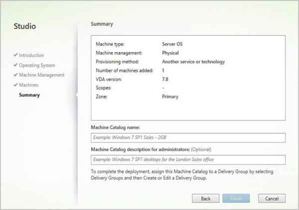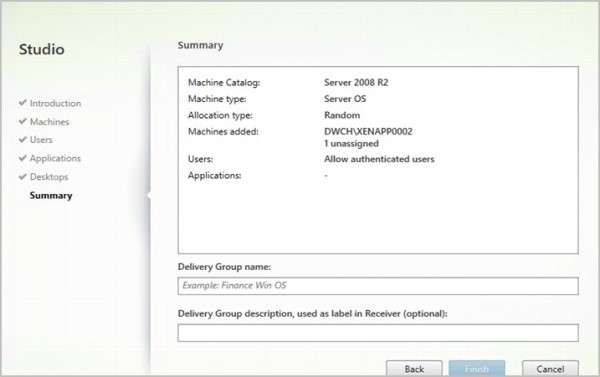 In the Summary screen, provide a name for the newly defined delivery group. You may also add a description of this group if you wish. Select Finish when you are done.
