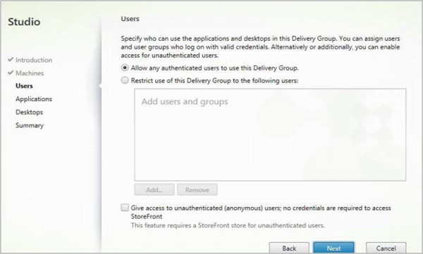 In the Users screen, specify the users allowed to access to the applications installed in the machines added to your delivery group. You can publish applications to all of the users in your domain if you wish. Click Next when you are finished.