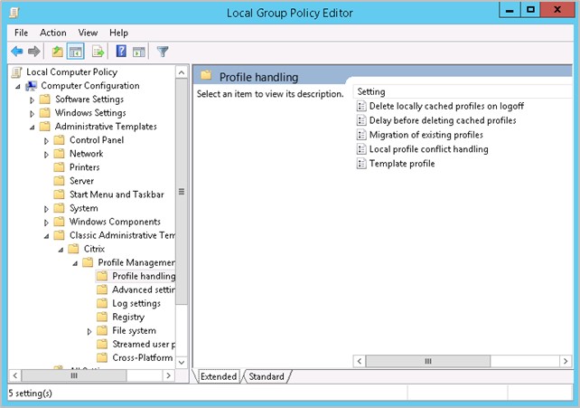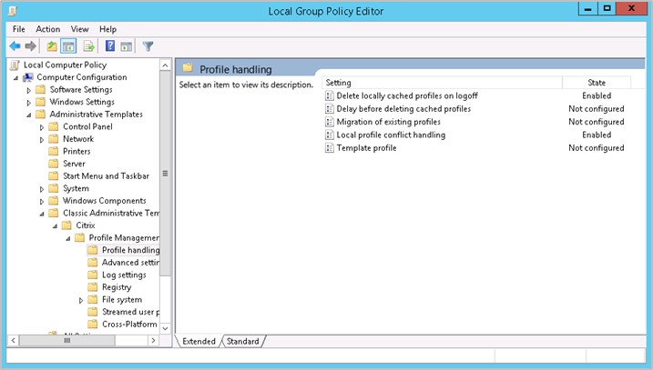In the Local Group Policy Folder, go to Administrative Templates > Classic Administrative Templates (ADM) > Citrix > Profile Management > Profile handling.