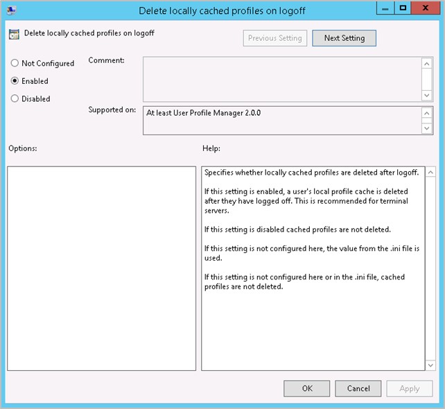Select Delete locally cached profile on logoff and, in the middle pane that displays, select Edit policy setting. Ensure that this setting is Enabled.