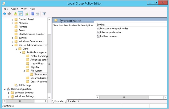 In the Local Group Policy Folder, go to Administrative Templates > Classic Administrative Templates (ADM) > Citrix > Profile Management > File system > Synchronization.