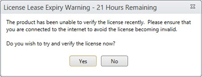 When a license lease (i.e., the time between two verification instances) is about to expire and no internet connection is detected, the following message displays: