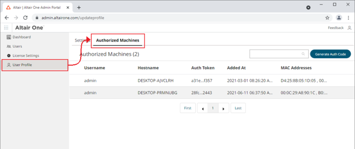 Once logged in to the portal, navigate to User Profile > Authorized Machines.