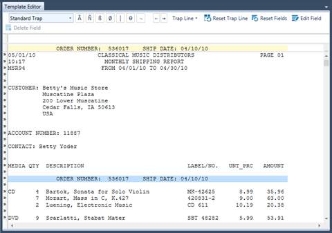 In the Classic.prn report, orders are sorted by order number. Also at this sort level is the ship date. We’ll create an append template to extract these two fields and an additional append template to extract the account number and contact fields that appear at the next higher level.