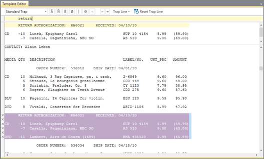 If we were to trap the order numbers using an exact trap (e.g., a colon), the return authorization will also be picked up. When we trapped the order number line in a previous exercise, we used an exact trap and specified that all order numbers beginning with 5 must be captured. But what happens when the order number begins with a 3 or a 4? Let’s use an exclusion template to address this issue.