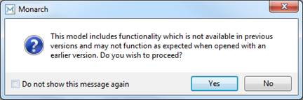 Remember that in a previous lesson, we created an exclusion template. This template is a new feature made available only in Monarch 13.2. Models saved using this template may not function properly when opened in a previous Monarch version, such as Monarch 13.1. The same problem is encountered when saving models containing character list traps, which are not supported in earlier Monarch versions. The following compatibility warning displays to remind you of this limitation.