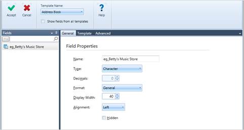 The first line of the address block is copied into the Sample Text box of the Template Editor.