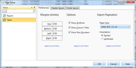 The Page Setup dialog displays page options available for Table view.