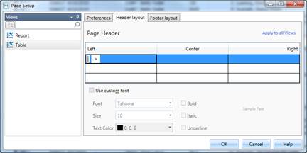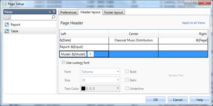 A page header is divided into three sections, Left, Center, and Right, all of which represent locations in which you may want to add information. You can dynamically add information to the page header, including page numbers, the print date and time, the names of the active filter and sort, as well as the first value of any field in the table. You can also add any text you wish and even specify the font to use in the header.