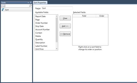 The Available Fields box displays the fields from the table. The Selected Fields box displays the fields used in the sort definition, from highest sort level to lowest. To add a field to the definition, select the field from the Fields box, then click Add >>. To remove a field, select the field from the Selected Fields box, then click << Remove.