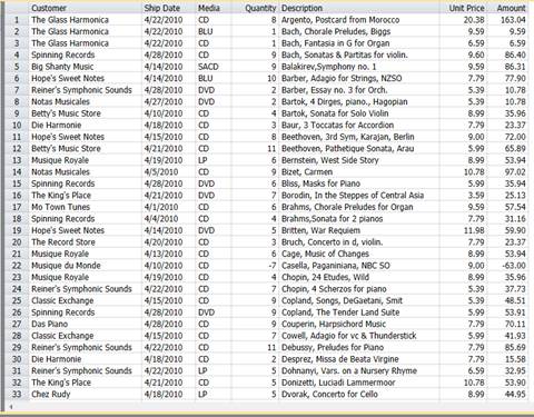 The Classic report is sorted by Customer and Ship Date. When the report data is extracted and assembled as records in the Table view, the records appear in the same order. Records for Betty’s Music Store appear first, then records for Big Shanty Music, and so on. Within each customer, the records are sorted by ship dates. While this sort order is useful, you may want to view the data in another order. Let’s sort the table based on the Description field.