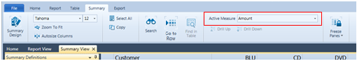 1. On the Summary view ribbon, click the drop-down arrow of the Active Measure list box. This box currently displays “Amount.”