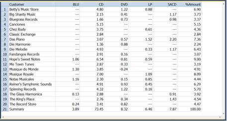 The summary is re-displayed to show media sales as a percent of total sales. Note that the Summary line at the bottom of the summary displays the percentages represented by each media type across all customers and the rightmost column represents percentages for by each customer across all media types.