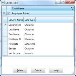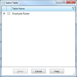 The Select Table dialog displays all of the database tables and queries that are available within the selected database. This list does not include system tables or queries, which hold information about the database structure.