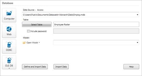 Monarch displays the path to the Employ.mdb file in the dialog’s Data Source box.